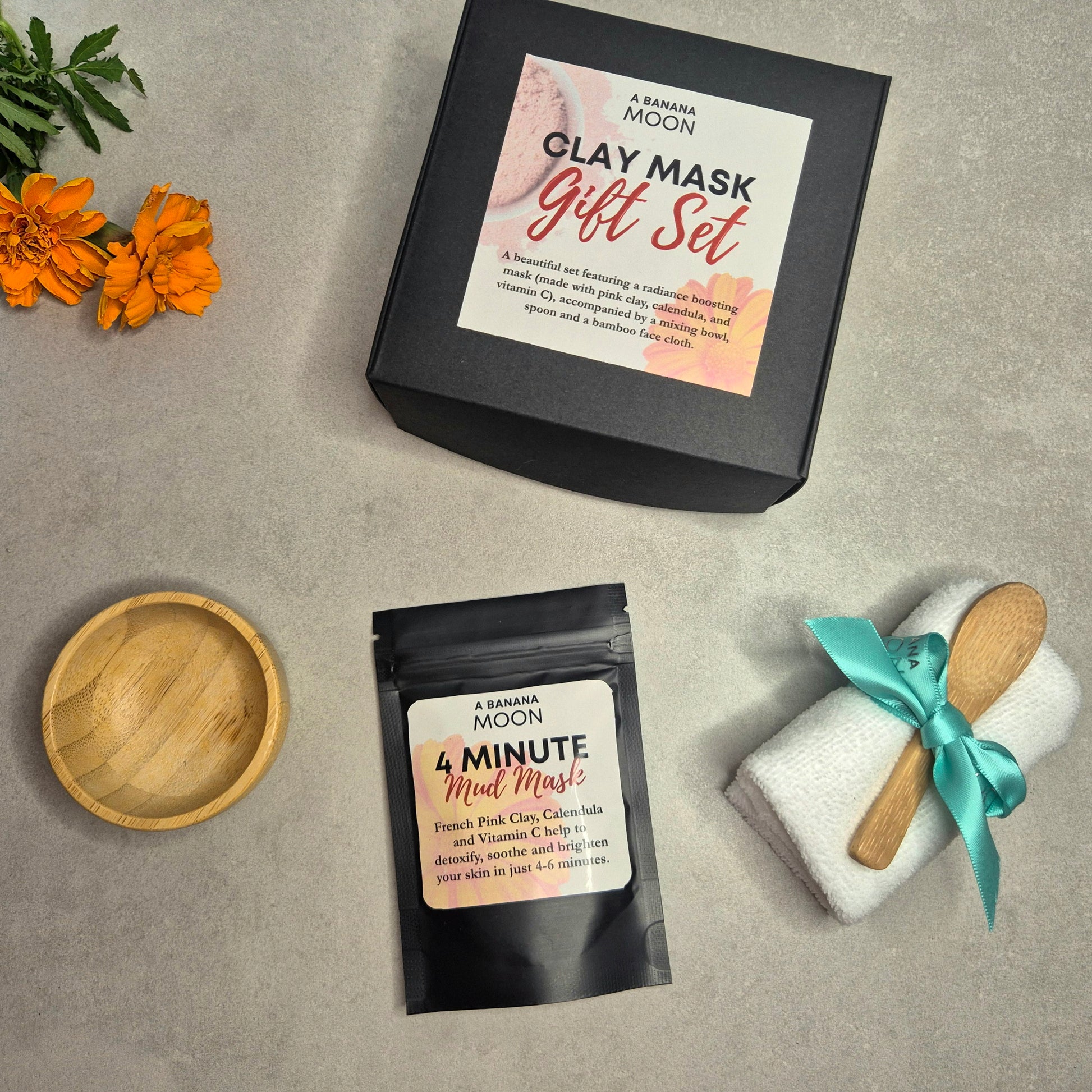Box contains; 4 Minute Mud Mask, bamboo bowl and spoon, bamboo face cloth.